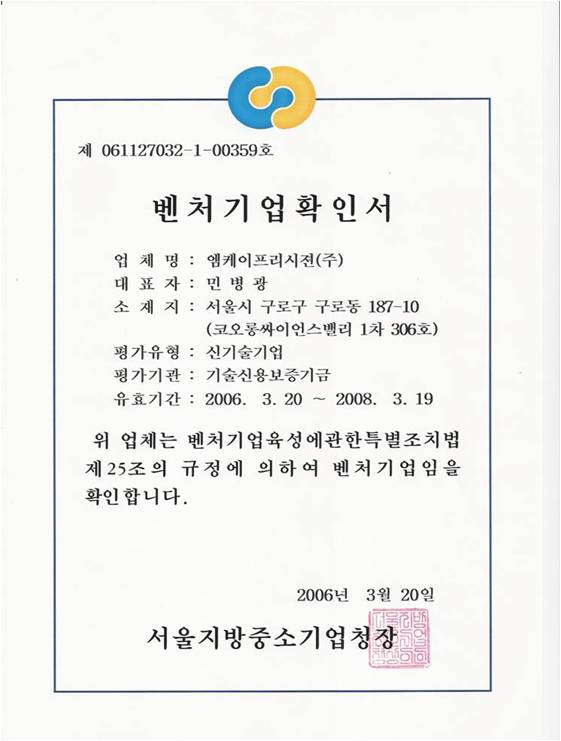 저희 엠케이프리시젼은 2006년 3월 중소기업청에서 인증한 벤처기업으로 등록되었습니다.